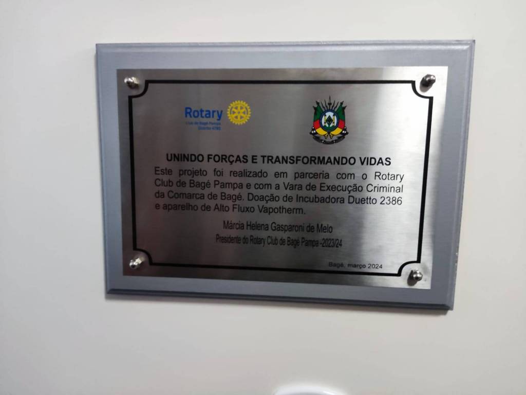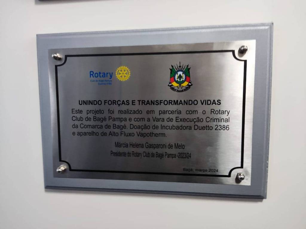 Através de um chamamento público promovido pela Vara de Execuções Criminais da Comarca de Bagé (Edital de Convocação n. 01/2023), o Rotary Clube Pampa foi agraciado com fundos provenientes de penas alternativas aplicadas em processos criminais. Foram apresentados dois projetos, em parceria com a Santa Casa de Caridade de Bagé, cujo intuito era a aquisição de dois equipamentos para a UTI Neonatal do Hospital: um aparelho respirador (Sistema de Alto Fluxo - TREND Medical) e uma incubadora híbrida Duetto para cuidados intensivos de prematuros de extremo baixo peso (bebês com menos de 1.500 gramas).