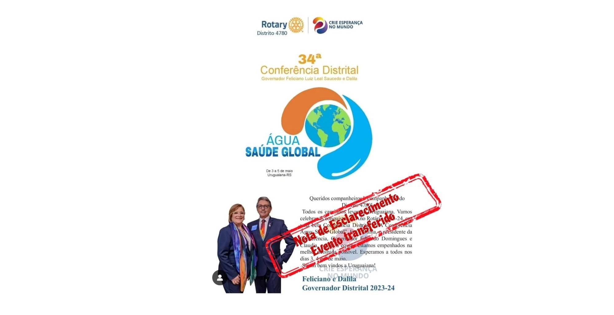 Nossa 34ª Conferência Distrital - Água Saúde Global, foi transferida para os dias 06, 07 e 08 de Junho de 2024. Estávamos com tudo pronto mas devido a situação de varias rodovias interditadas em função das fortes chuvas que atingem o nosso Estado,não teríamos a participação esperada de todos. Obrigado e vamos com fé em Deus continuar nossa caminha de CRIAR ESPERANÇA NO MUNDO!