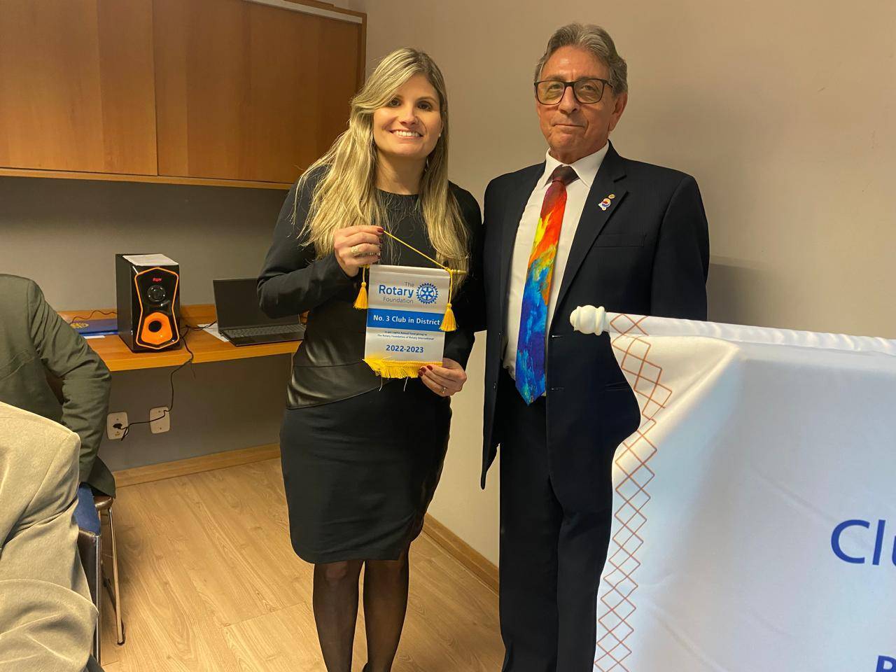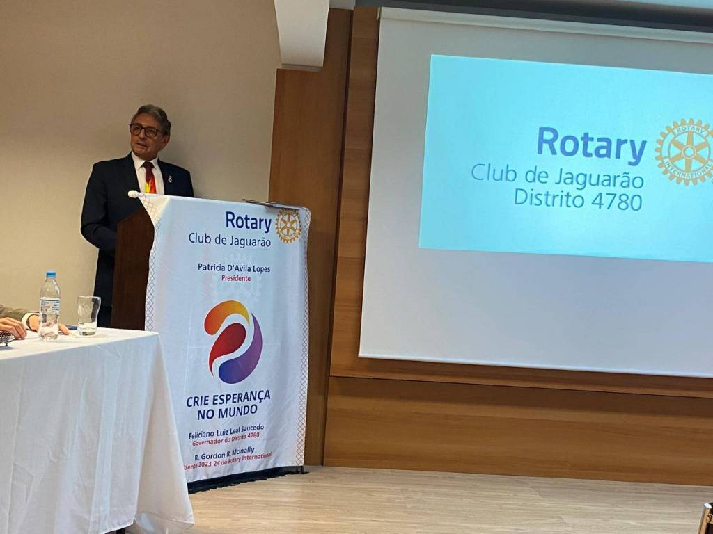 Governador do Distrito 4780, Feliciano Saucedo fala da importância da Fundação Rotária e realiza a entrega da flâmula pelo clube ser um dos principais doadores da FR . Parabéns Rotary Club de Jaguarão