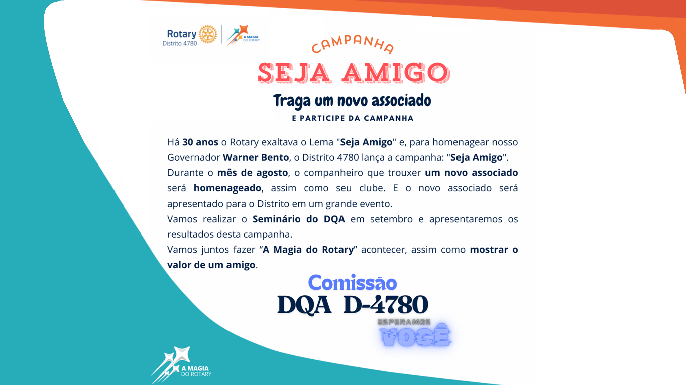 Há 30 anos o Rotary exaltava o Lema "Seja Amigo" e, para homenagear nosso Governador Warner Bento, o Distrito 4780 lança a campanha: "Seja Amigo".