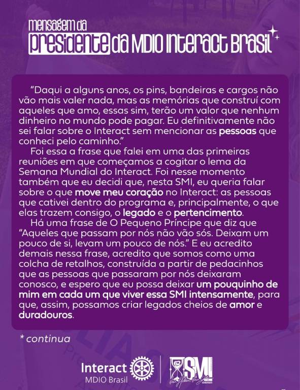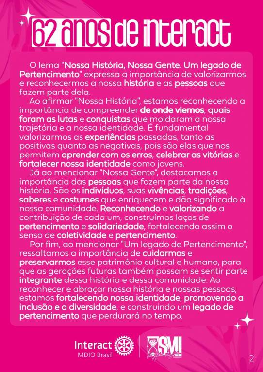 Nosso Distrito 4780 está plenamente engajado nesse contexto, trabalhando em conjunto com companheiros interactianos e seus conselheiros rotarianos para mostrar ao mundo “A Magia do Rotary”. Nesta semana tão significativa, daremos visibilidade às ações dos clubes de Interact do nosso distrito, valorizando o esforço e a dedicação de cada participante.