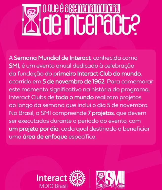 O Interact proporciona aos jovens a chance de compartilhar experiências e sonhos, formando um legado de liderança e transformação. Para celebrar e reconhecer esses esforços, foi criada a “Semana Mundial de Interact” (SMI), uma semana anual dedicada à comemoração do primeiro clube Interact do mundo. Durante essa semana, Interact Clubs de todo o mundo realizam projetos, cada um destinado a uma área de enfoque específica. No Brasil, a SMI envolve sete projetos, sendo um por dia, todos voltados a gerar impacto em diversas frentes.