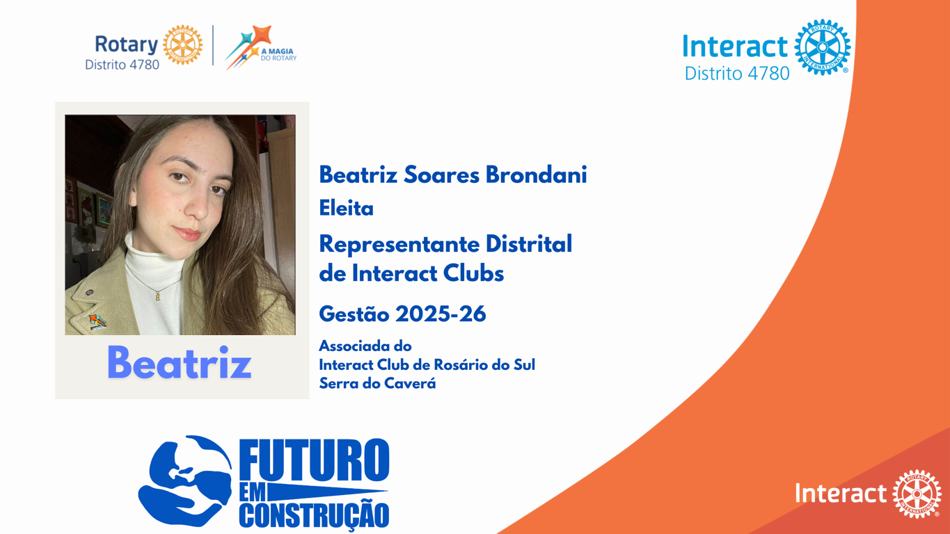 Beatriz foi eleita Representante Distrital de Interact Clubs (RDI) do Distrito 4780 para a gestão 2025-26. Sua função será a de liderar e representar os Interact Clubs do distrito, promovendo o fortalecimento da rede de Interactianos, incentivando o desenvolvimento de projetos de impacto social, e promovendo o crescimento pessoal e de liderança entre os jovens participantes. Além disso, Beatriz atuará como elo de comunicação entre os clubes de Interact e o Rotary, organizando eventos, treinamentos e colaborando para que os clubes do distrito alcancem os objetivos rotários, sempre destacando os valores e a missão do Rotary.