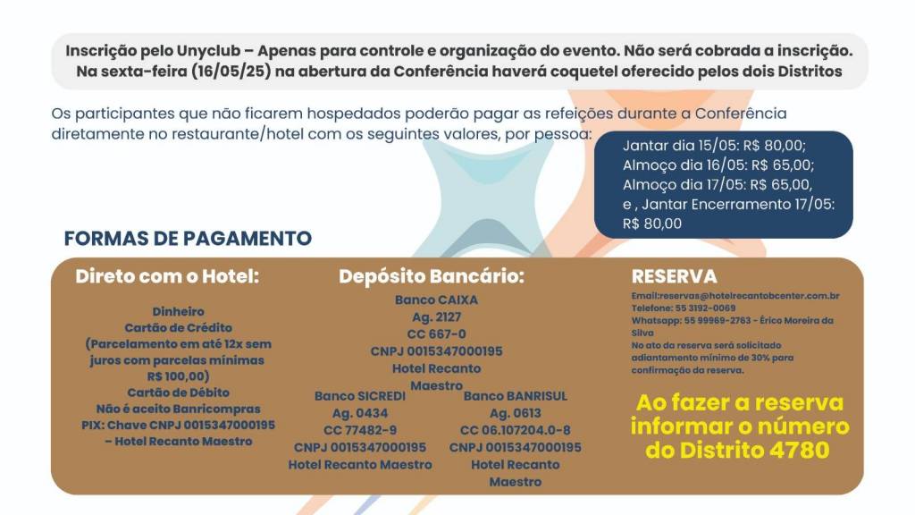 Fique por dentro do que você precisa fazer para sua reserva, te liga nas datas e venha desfrutar conosco de dias de muita troca de informações e companheirismo.