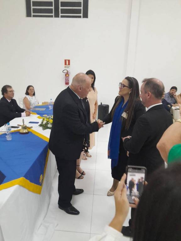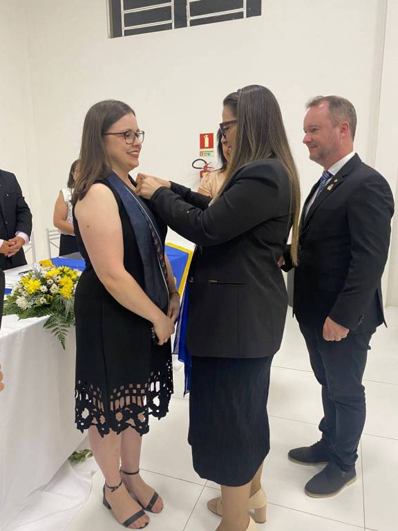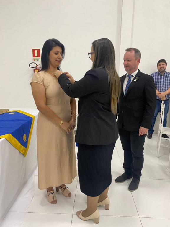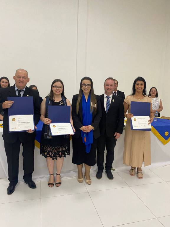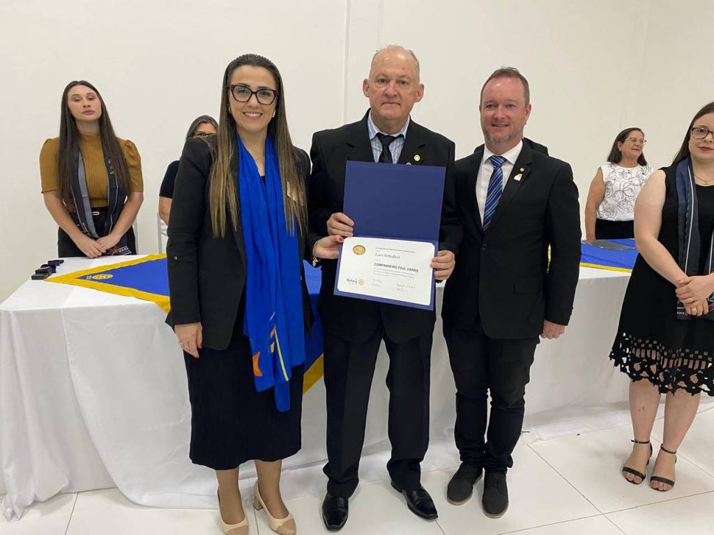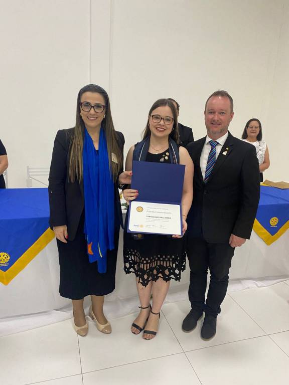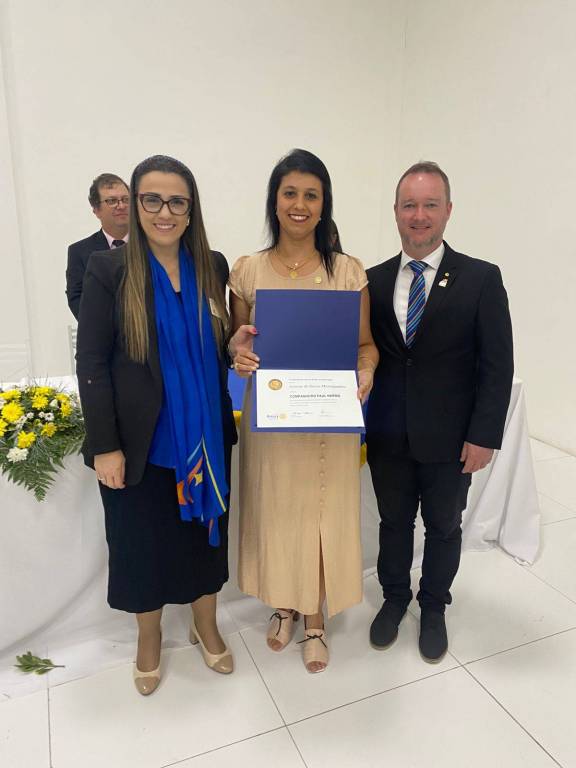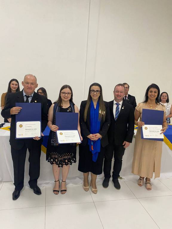 Governadora Patrícia Parreira participa da entrega dos Títulos Paul Harris a companheiros destacados, incluindo Lari Scholten do Rotary Centro, Priscilla Guedes e Lisiane Mozzaquatro, ambas do Rotary Areias Brancas